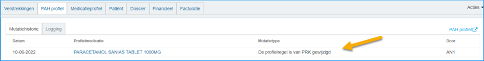 · In de mutatiehistorie van het PAH profiel is de wijziging zichtbaar (PRK wijziging)