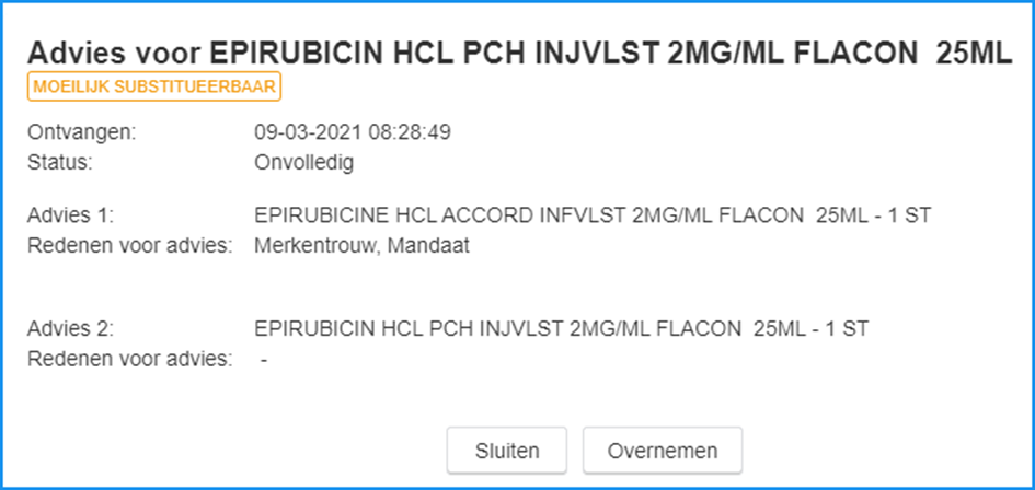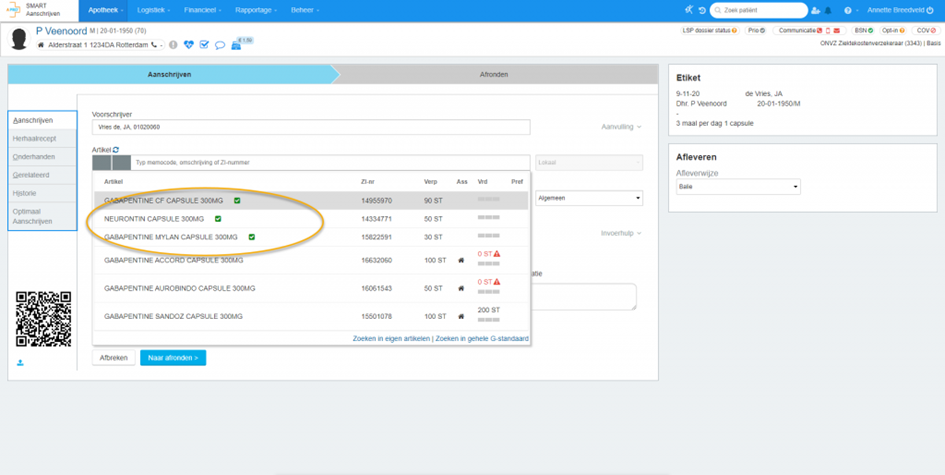 Op het moment van selecteren van het artikel wordt opnieuw bij SLIM Aanschrijven een advies gevraagd voor het geselecteerde artikel. Dit wordt gedaan bij het aanschrijven van digitale voorschriften ter validatie, maar ook bij handmatige aanschrijvingen waar nog geen eerder advies voor bekend was. Op basis van het verkregen advies wordt in het scherm zichtbaar of de keuze door SLIM Aanschrijven bevestigd wordt.