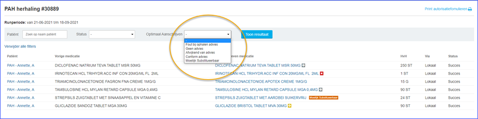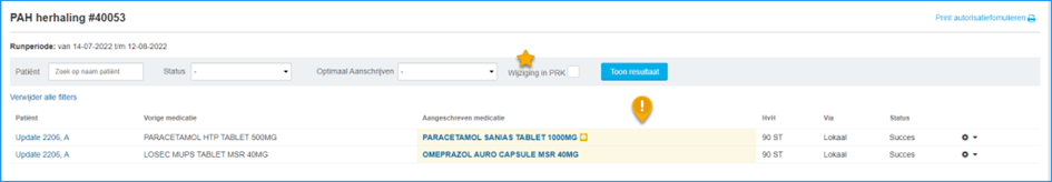 · Het artikel is vervangen en geel gemarkeerd in het PAH run overzicht. Dit overzicht is zichtbaar na het maken van een run. In dit voorbeeld is te zien dat Omeprazol mut tablet vervangen is door Omeprazol capsules op basis van het advies.