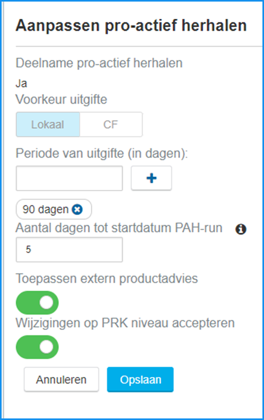 Tip: Het advies van de wijziging op PRK niveau is afkomstig van een derde partij. De dosering wordt niet gewijzigd in APRO. Check na het maken van de run of er regels zijn die een andere dosering nodig hebben. Denk bijvoorbeeld aan het vervangen van een tablet met gereguleerde afgifte naar een normale afgifte.